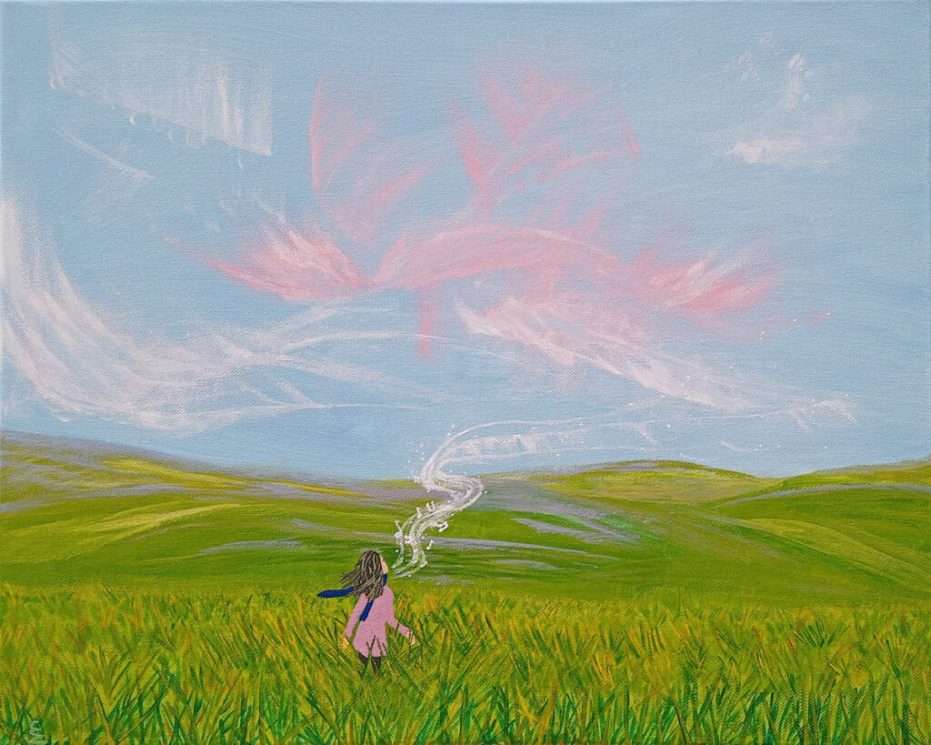 Het lied van de wolken. Zo heb ik dit kunstwerk genoemd. Terwijl ik aan dit schilderij werkte, begon ik spontaan een melodie te neuriën. Ineens zag ik een vrouw voor me die uitkijkt over het landschap en een lied oppikt. Een melodie die verborgen ligt in de heuvels nestelt zich in haar hoofd om uiteindelijk als lied weer het landschap in te stromen, waar het wordt meegevoerd door de wolken.