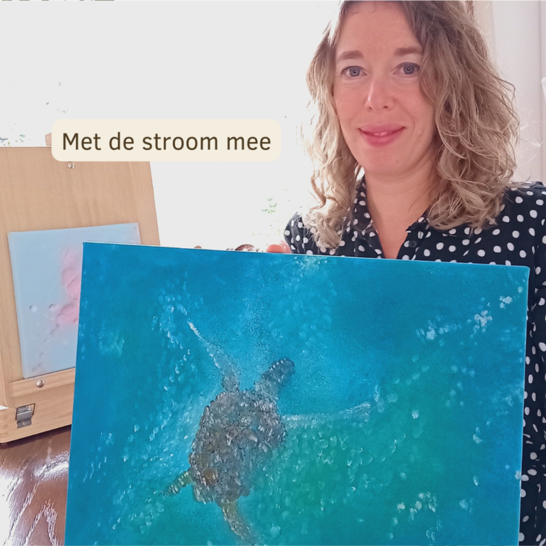 Met de stroom mee. Zo heb ik dit kunstwerk genoemd. Laat je zonder verzet meevoeren met alles wat het leven je brengt. Zoals de schildpad in de oceaan die zich laat meevoeren door de stromingen in zee. En zo vanzelf uitkomt op de plekken waar hij thuishoort.