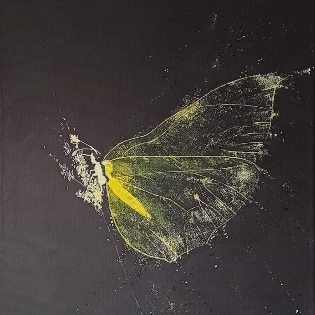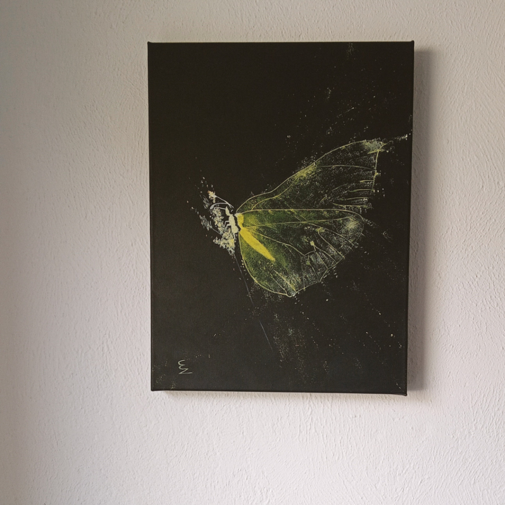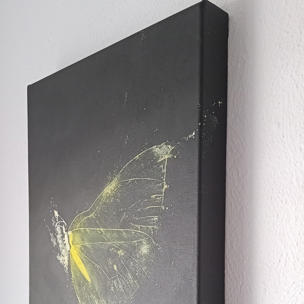 Wat als jij jouw diepste verlangen het stralende middelpunt in je leven laat zijn? In plaats van dat je het voor altijd laat sluimeren in het donker. Dat is waar deze vlinder op het doek jou bij stil wil laten staan.